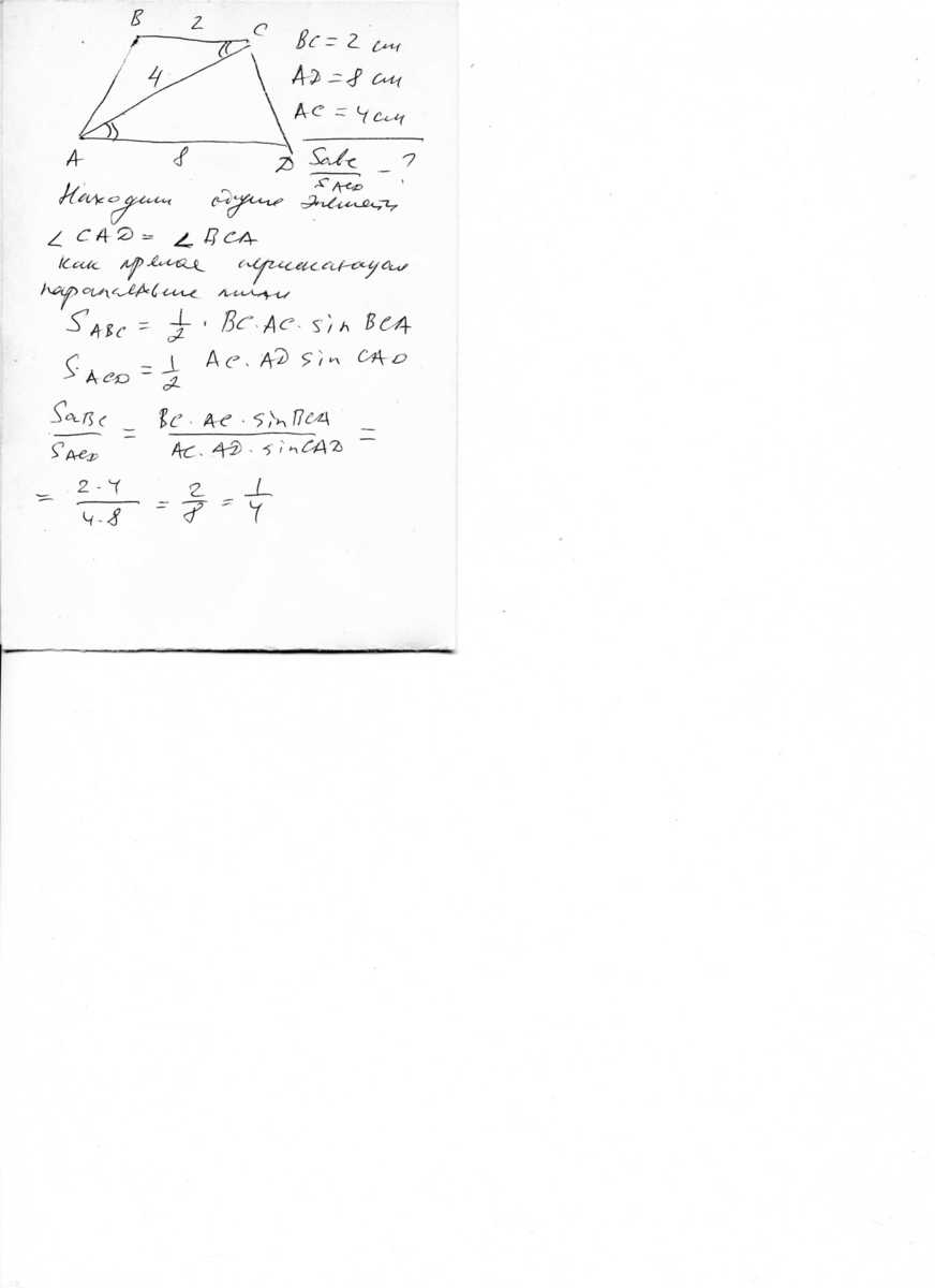 В трапеции ABCD основания BC и AD равны 2 см и 8 см , а диагональ AC равна 4 см . В каком отношение делит диагональ AC площадь трапеции ?