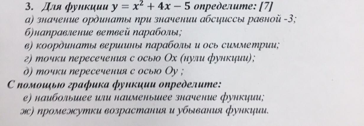 а) значение ординаты при значении абсциссы равной -3; б)направление ветвей параболы; д) точки пересечения с осью Оу; в) координаты вершины параболы и ось симметрии;