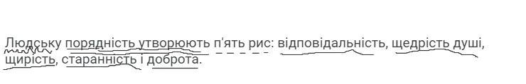 Ответ: Людську порядність утворюють п'ять рис: відповідальність, щедрість душі, щирість, старанність і доброта. (речення розповідне, неокличне, поширене, ускладнене однорідними членами речення)