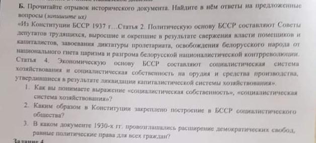 Б. Прочитайте отрывок исторического документа. Найдите в нем ответы на предложенные попросы (запишите их) «Из Конституции БССР 1937 г...Статья 2. Политическую основу БССР составляют Советы депутатов трудящихся, выросшие и окрепшие в результате свержения класти помешиков и капиталистов, завоевания диктатуры пролетариата, освобождения белорусского народа от национального гнета царизма и разгрома белорусской националистической контрреволюции основу БССР составляют социалистическая хозяйствования и социалистическая собственность на орудия и средства производства. утвердившиеся в результате ликвидации капиталистической системы хозяйство шия>> Статья 4. Экономическую 1. Как вы понимаете выражение социалистическая собственность, социалистическая система хозяйствования ? 2. Каким образом в Конституции закреплено построение в БССР социалистического система общества? 3. В каком документе 1930-х гг. провозглашались расширение демократических свобол. равные политические права для всех граждан? З 1