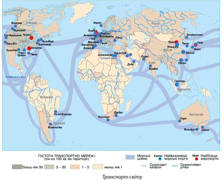 ЗАВДАННЯ 1. Нанесіть на карту три держави, у яких за вантажообігом переважає морський транспорт (за вибором). 2. Нанесіть на карту п'ять держав, у яких за вантажообігом переважає залізничний транспорт (за вибором). 3. Нанесіть на карту п'ять держав, у яких за вантажообігом переважає автомобільний транспорт (за вибором). 4. Нанесіть на карту: а) найважливіші морські шляхи; б) найважливіші морські канали.