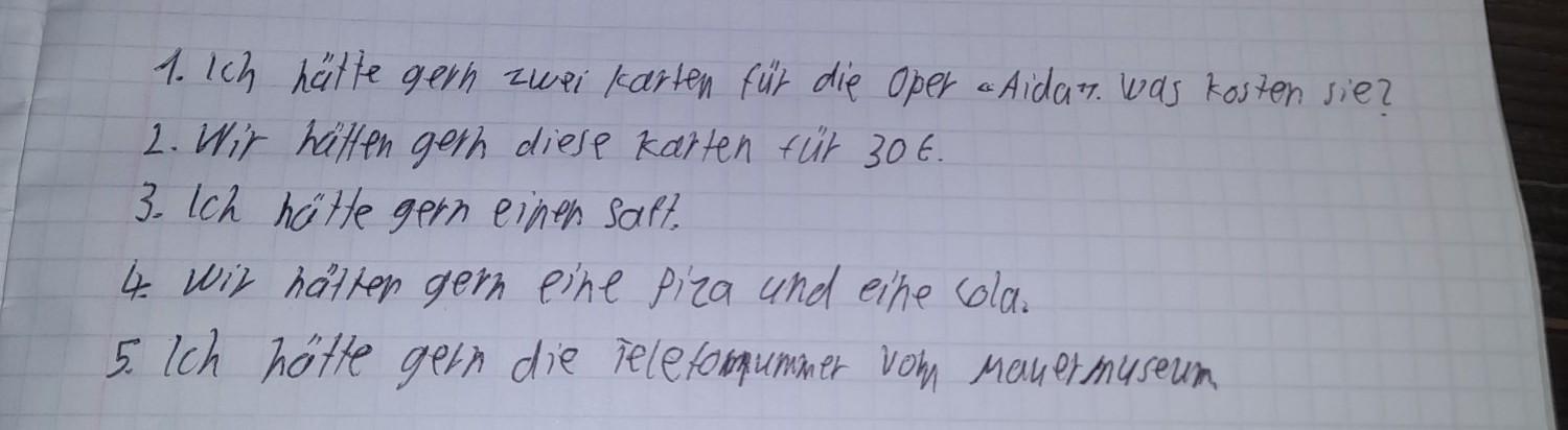 1. Ich möchte zwei Karten für die Oper «Aida». Was kosten sie?