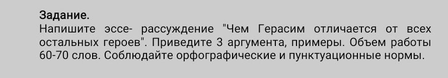 Напишите эссе- рассуждение "Чем Герасим отличается от всех остальных героев". Приведите 3 аргумента, примеры. Объем работы 60-70 слов. Соблюдайте орфографические и пунктуационные нормы.