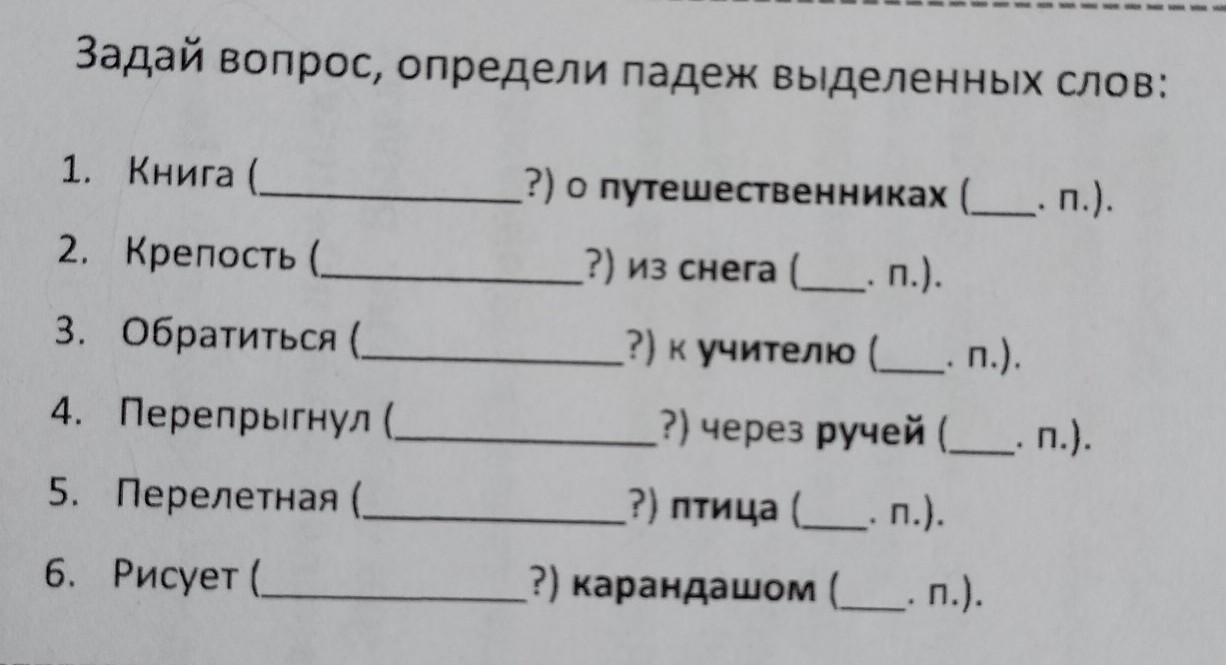 Задай вопрос, определи падеж выделенных слов: ?) о путешественниках (____. п.). ?) из снега (. п.). ?) к учителю (. п.). ?) через ручей (. п.). ?) птица (. п.). ?) карандашом ( . п.). 1. Книга ( 2. Крепость ( 3. Обратиться 4. Перепрыгнул ( 5. Перелетная ( 6. Рисует