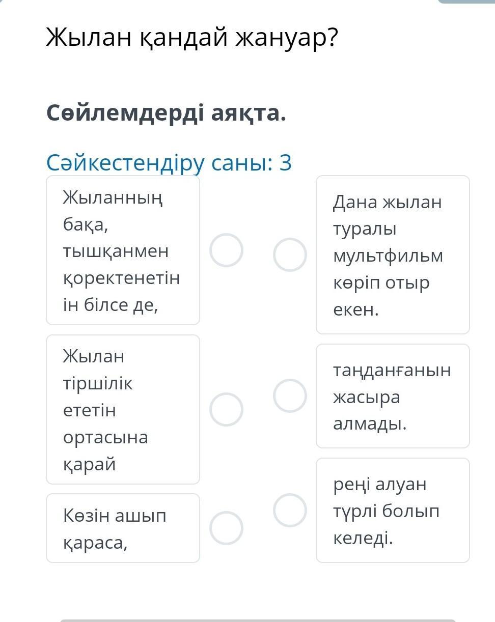 Сөйлемдерді аяқта. Сәйкестендіру саны: 3 Жыланның бака, тышқанмен қоректенетін ін білсе де, Жылан тіршілік ететін ортасына қарай Көзін ашып қараса, о о Дана жылан туралы мультфильм көріп отыр екен. таңданғанын жасыра алмады. реңі алуан түрлі болып келеді.