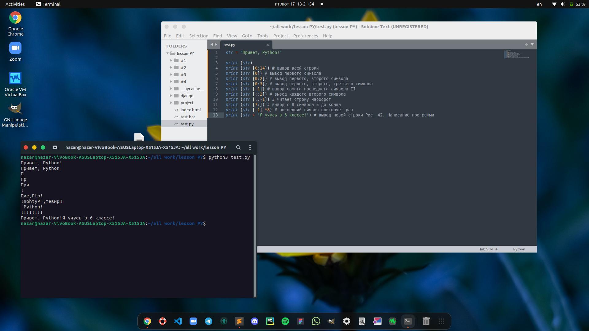 print (str + File Edit Format Run Options Window Help str = "Привет, Python!" print (str [0:14]) # вывод всей строки print (str [0]) # вывод первого символа print (str [0:2]) # вывод первого, второго символа print (str [0:3]) # вывод первого, второго, третьего символа print (str [-1]) # вывод самого последнего символа II print (str [::2]) # вывод каждого второго символа print (str [::-1]) # читает строку наоборот print (str [7:]) # вывод с 8 символа и до конца print (str [-1] *8) # последний символ повторяет раз print (str + "Я учусь в 6 классе!") # вывод новой строки Рис. 42. Написание программы