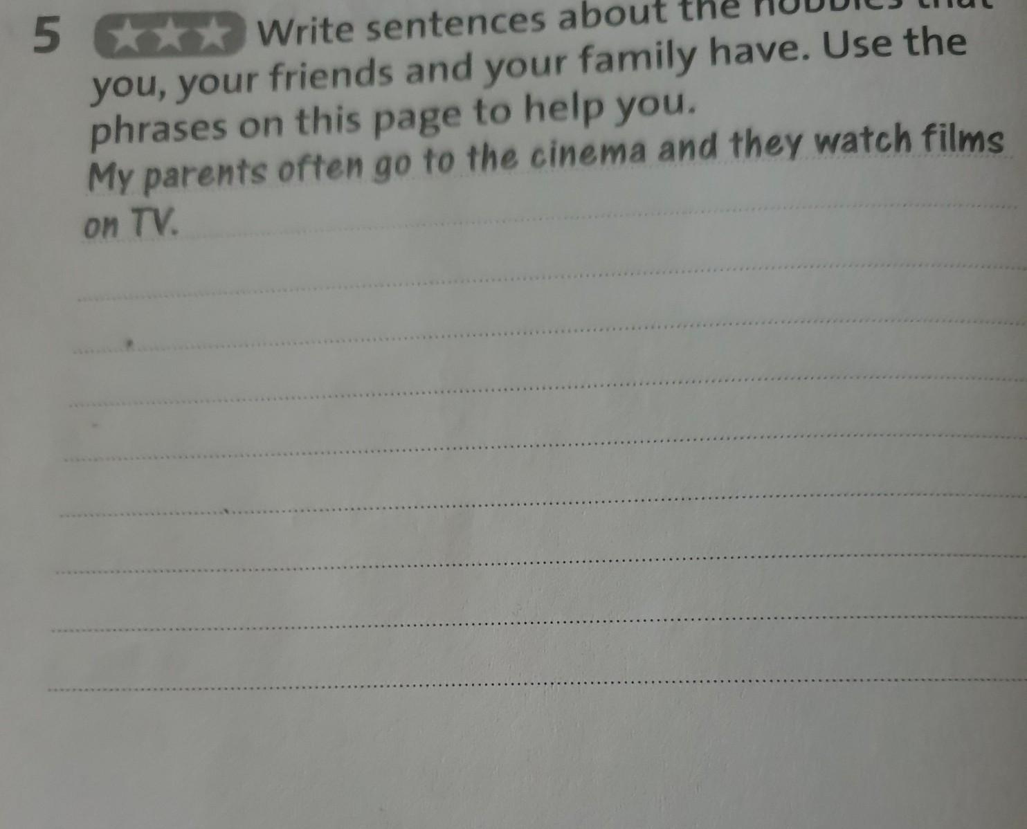5 **Write sentences about the hobbies that you, your friends and your family have. Use the phrases on this page to help you. My parents often go to the cinema and they watch films on TV.