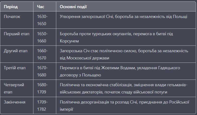 Объяснение: Зазначу, що дати в табличці є приблизними і відрізняються у різних історичних джерелах. Крім того, розподіл на етапи може відрізнятися у різних авторів.