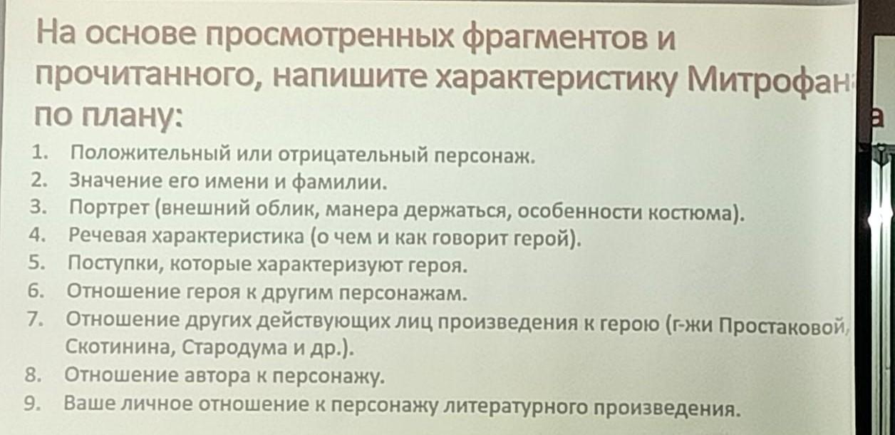 На основе просмотренных фрагментов и прочитанного, напишите характеристику Митрофана по плану: 1. Положительный или отрицательный персонаж. 2. Значение его имени и фамилии. 3. Портрет (внешний облик, манера держаться, особенности костюма). 4. Речевая характеристика (о чем и как говорит герой). 5. Поступки, которые характеризуют героя. 6.Отношение героя к другим персонажам. 7.Отношение других действующих лиц произведения к герою (г-жи Простаковой, Скотинина, Стародума и др.). 8. Отношение автора к персонажу. 9. Ваше личное отношение к персонажу литературного произведения.