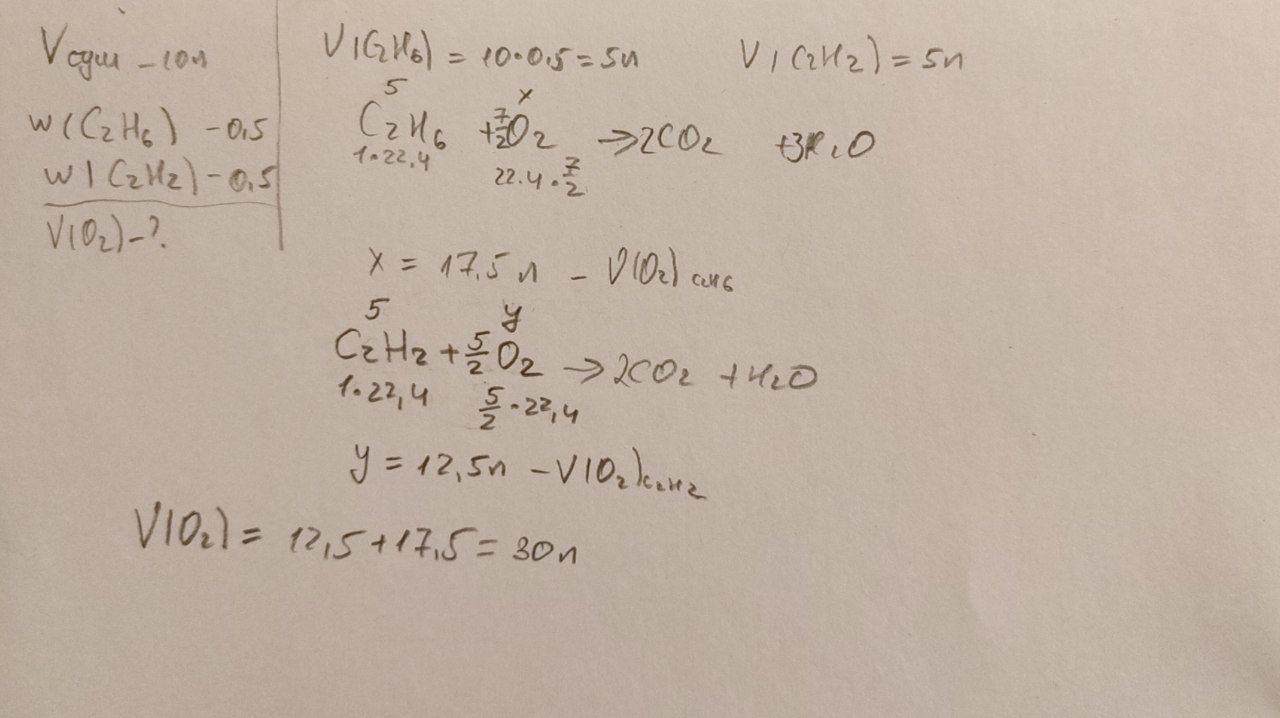 Який об'єм кисню необхідно для спалювання суміші об'ємом 10 л.,яка складається із 50%етану і 50% етину ?