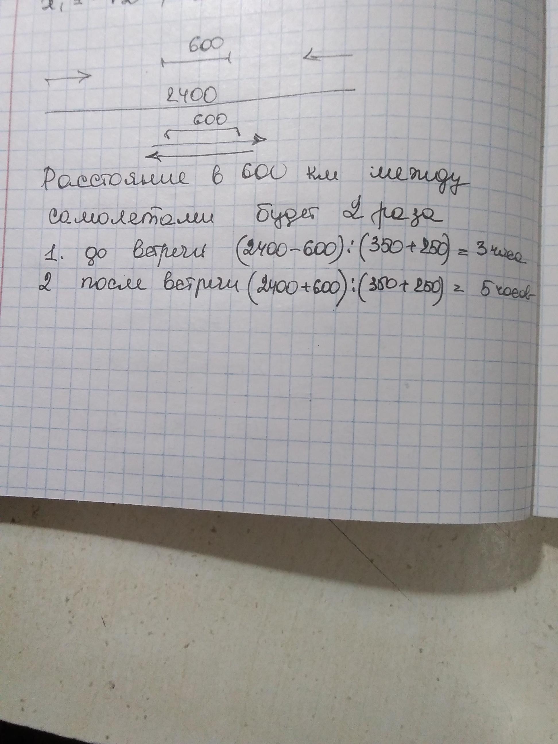 из двух городов растояние между которыми 2400 км,вылетели одновременно навстречу друг другу два самолета. скорость одного из них равна 350 км/ч,а второго 250 км/ч. через сколько часов расстояние между ними составило 600 км? срочно