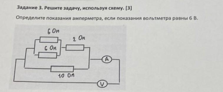 Задание 3. Решите задачу, используя схему. [3] Определите показания амперметра, если показания вольтметра равны 6 в