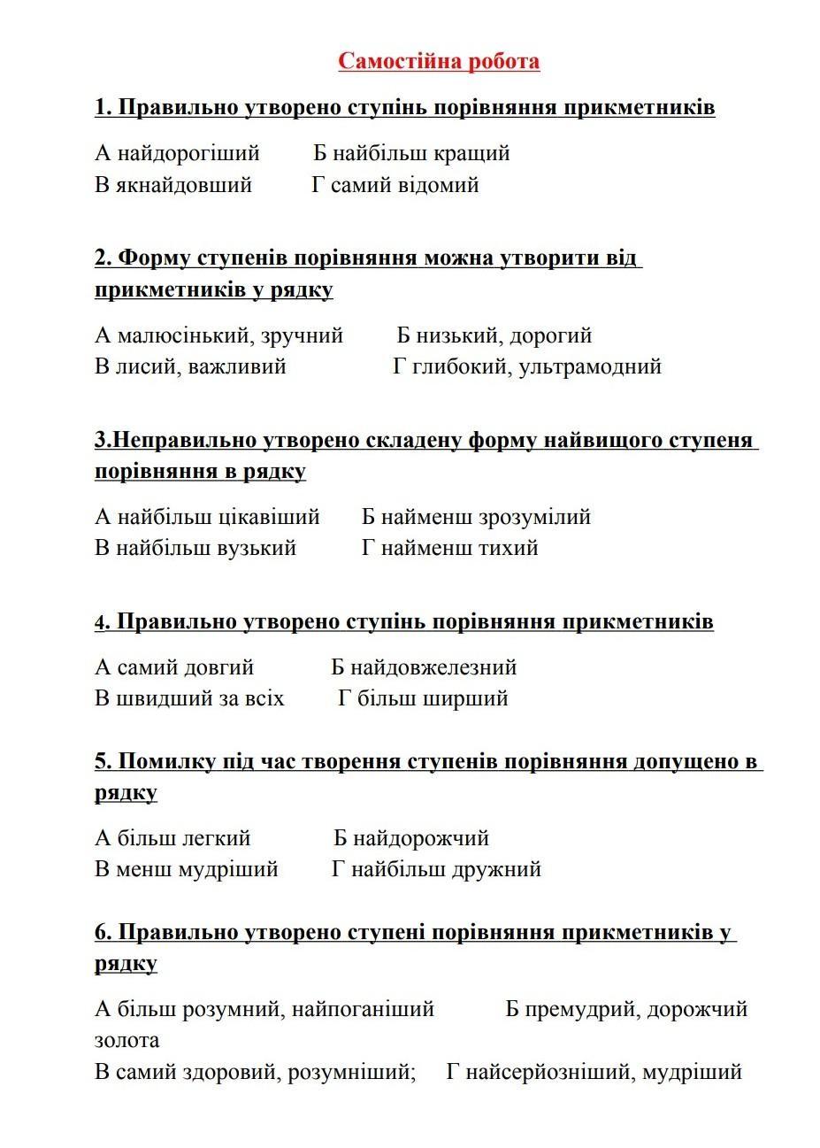ПЖ помогите дам100балов 1. Правильно утворено ступінь порівняння прикметників А найдорогіший Б найбільш кращий В якнайдовший Г самий відомий 2. Форму ступенів порівняння можна утворити від прикметників у рядку А малюсінький, зручний В лисий, важливий 3.Неправильно утворено складену форму найвищого ступеня порівняння в рядку А найбільш цікавіший В найбільш вузький Б низький, дорогий Г глибокий, ультрамодний Б найменш зрозумілий Г найменш тихий 4. Правильно утворено ступінь порівняння прикметників А самий довгий В ШВИДШИЙ за всіх А бiльш легкий В менш мудріший Б найдовжелезний Г більш ширший 5. Помилку під час творення ступенів порівняння допущено в рядку Б найдорожчий Г найбільш дружний 6. Правильно утворено ступені порівняння прикметників у рядку А більш розумний, найпоганіший Б премудрий, дорожчий золота В самий здоровий, розумніший; Г найсерйозніший, мудріший