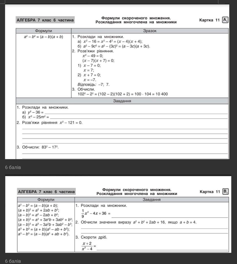 АЛГЕБРА 7 клас 6 частина формули a² - b² = (a - b)(a + b) 3. Обчисли: 83² - 17². 6 балів 1. Розклади на множники. a) x² - 16 = x² - 42 = (x - 4)(x + 4); б) a² - 9c² = a² - (3c)² = (a - 3c)(a + 3c). 2. Розв'яжи рiвняння. x² - 49 = 0; (x-7)(x + 7) = 0; Формули скороченого множення. Розкладання многочлена на множники Зразок 1. Розклади на множники. a) y² - 36 = б) x² - 25m² = 2. Розв'яжи рiвняння х² - 121 = 0. 1) x-7 = 0; x=7; 2) x + 7 = 0; x=-7. АЛГЕБРА 7 клас 6 частина формули [a² - b² = (a - b)(a + b): | (a + b)2 = a² + 2ab+b2: (a - b)² = a² - 2ab+b²; Вiдповiдь: -7; 7. 3. Обчисли. 102²-2² (102-2)(102 + 2) = 100-104 10 400 Завдання Формули скороченого множення. Розкладання многочлена на множники Завдання 1. Розклади на множники. - 4x + 36 = 9 (a + b)3 = a3 + 3a²b + 3ab2 + b3: (a - b)³ = a³ - 3a³b + 3ab² - 3 2. Обчисли значення виразу a² + b² + 2ab + 16, якщо a + b = 4. [a3 + b3 = (a + b)(a² - ab + b²); a3 - b3 = (a - b)(a² + ab + b²). 3. Скороти дріб. х+2 x² - 4 = Картка 11 А. Картка 11 B,