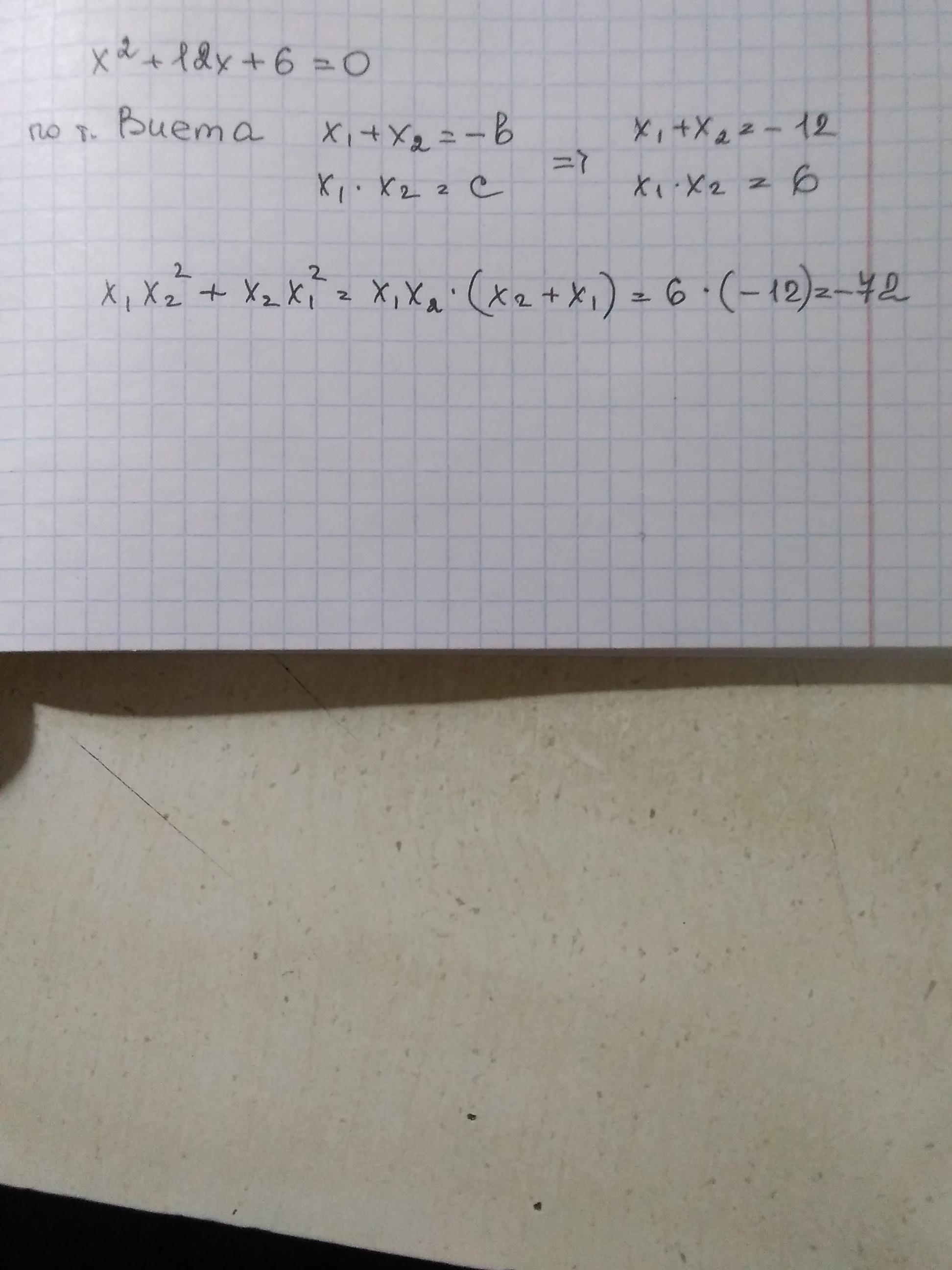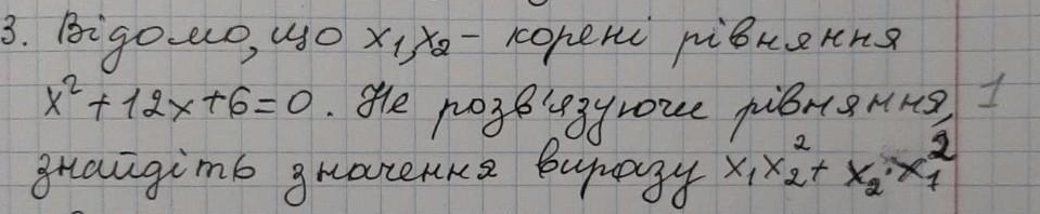 відомо що х1,х2 корені рівняння х²+12х+6=0. не розв'язуючи рівняння, знайдіть значення виразу х1×х2²+х2×х1²