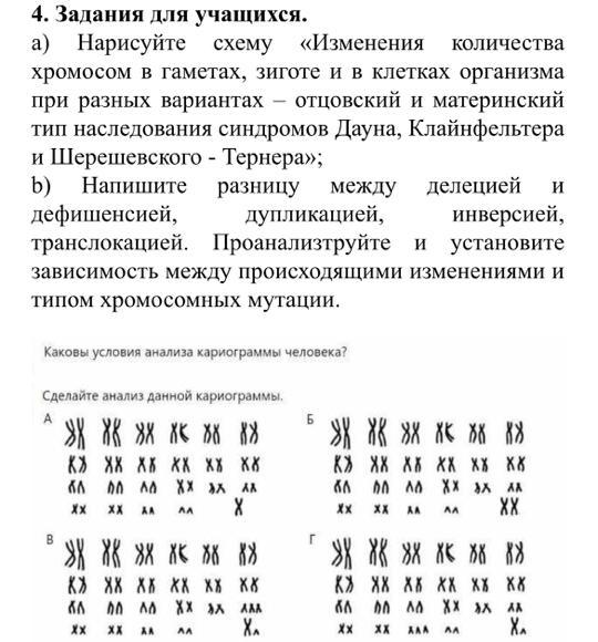 1) общее число хромосом, 2) число аутосом, 3) число половых хромосом, 4) пол (мужской или женский), 5) число глыбок Х-хроматина, 6) норма или патология (какое заболевание) (рис.2).