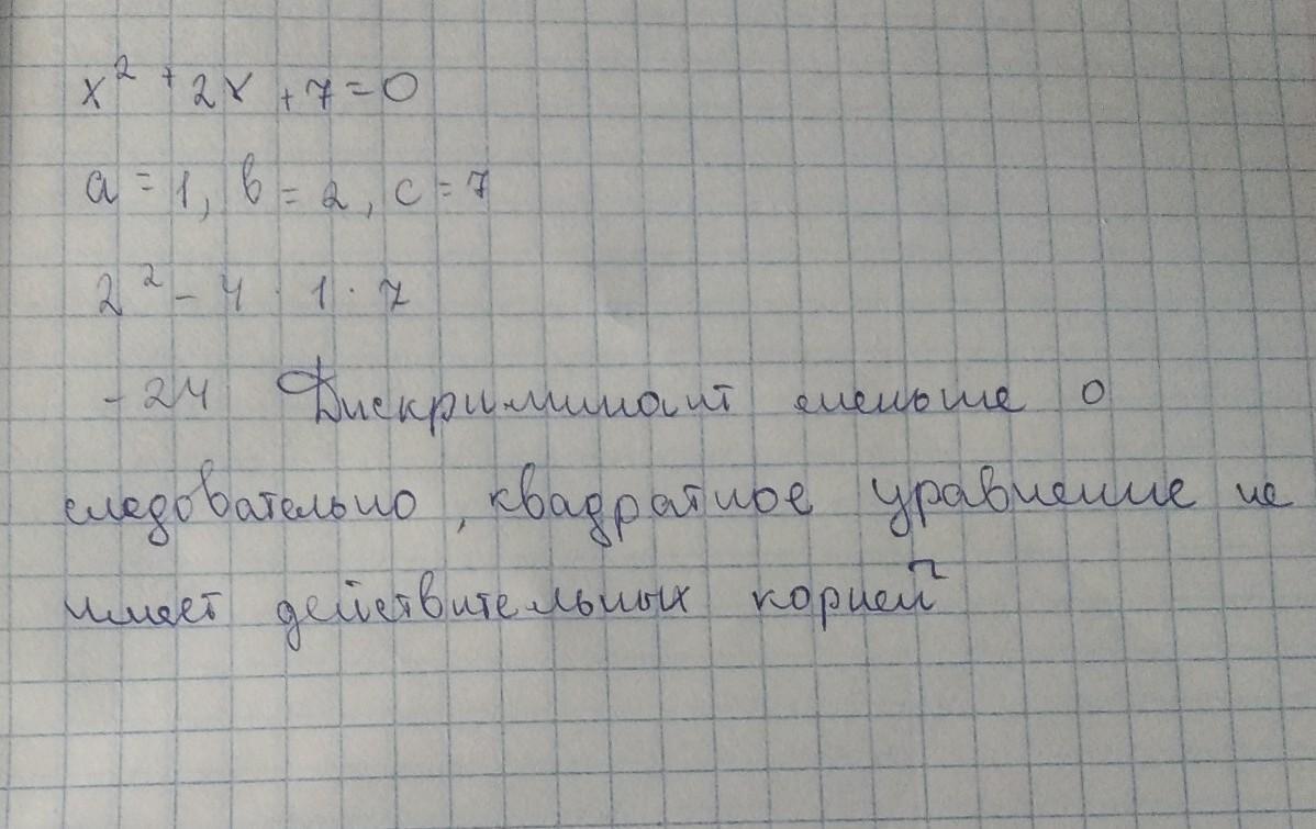 D = (2)² - 4(1)(7) = 4 - 28 = -24