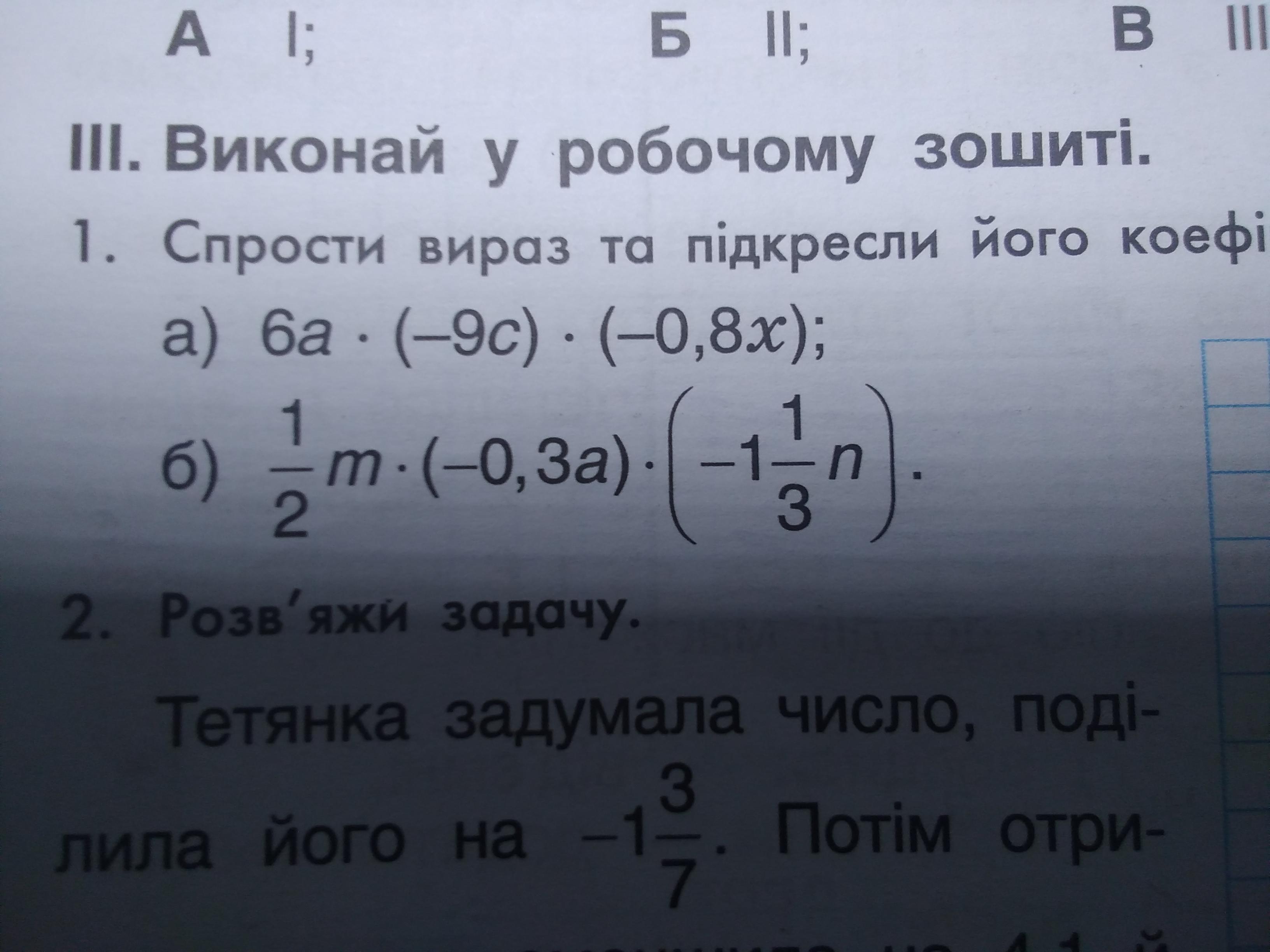 б) 1/2m*(-0,3a) *(-1 1/3n) = 1/2m*(-3/10a) *(-4/3n) = 1/5man=0,2man