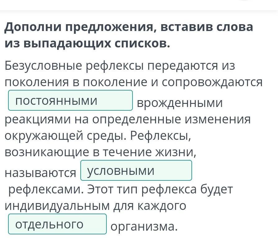 Дополни предложения, вставив слова из выпадающих списков. Безусловные рефлексы передаются из поколения в поколение и сопровождаются врожденными реакциями на определенные изменения окружающей среды. Рефлексы, возникающие в рефлексами. Этот тип рефлекса будет индивидуальным для течение жизни, называются каждого организма.