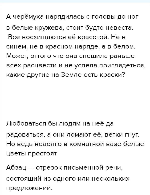 (недолго). 398Б. Прочитай текст. Раздели его на абзацы. А черемуха нарядилась с головы до ног в белые кружева, стоит будто невеста. Все восхищаются её красотой. Не в синем, не в красном наряде, а в белом. Может, оттого что она спешила раньше всех расцвести и не успела приглядеться, какие другие на Земле есть краски? Любоваться бы людям на неё да радо- ваться, а они ломают её, ветки гнут. Но ведь недолго в комнатной вазе белые цветы простоят. (По книге "Тайна красоты") пж подчеркните подлежащие и сказуемое