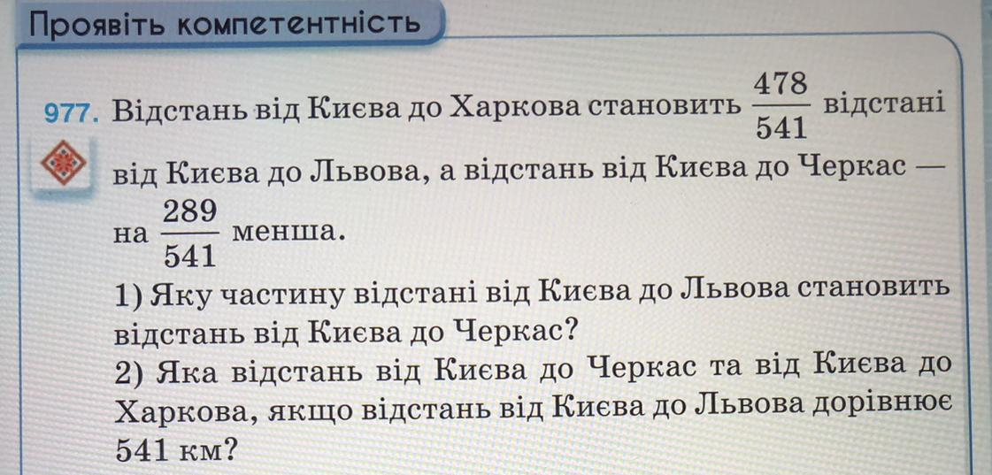 Відстань від Києва до Харкова становить 478/541 відстані від Києва до Львова ,а відстань від Києва до Черкас-на 289/541 менша. 1)Яку частину відстані від Києва до Львова становить відстань від Києва до Черкас? 2) Яка відстань від Києва до Черкас та від Києва до Харкова,якщо відстань від Києва до Львова дорівнює 541 км?