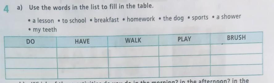 Have: lesson, breakfast, shower