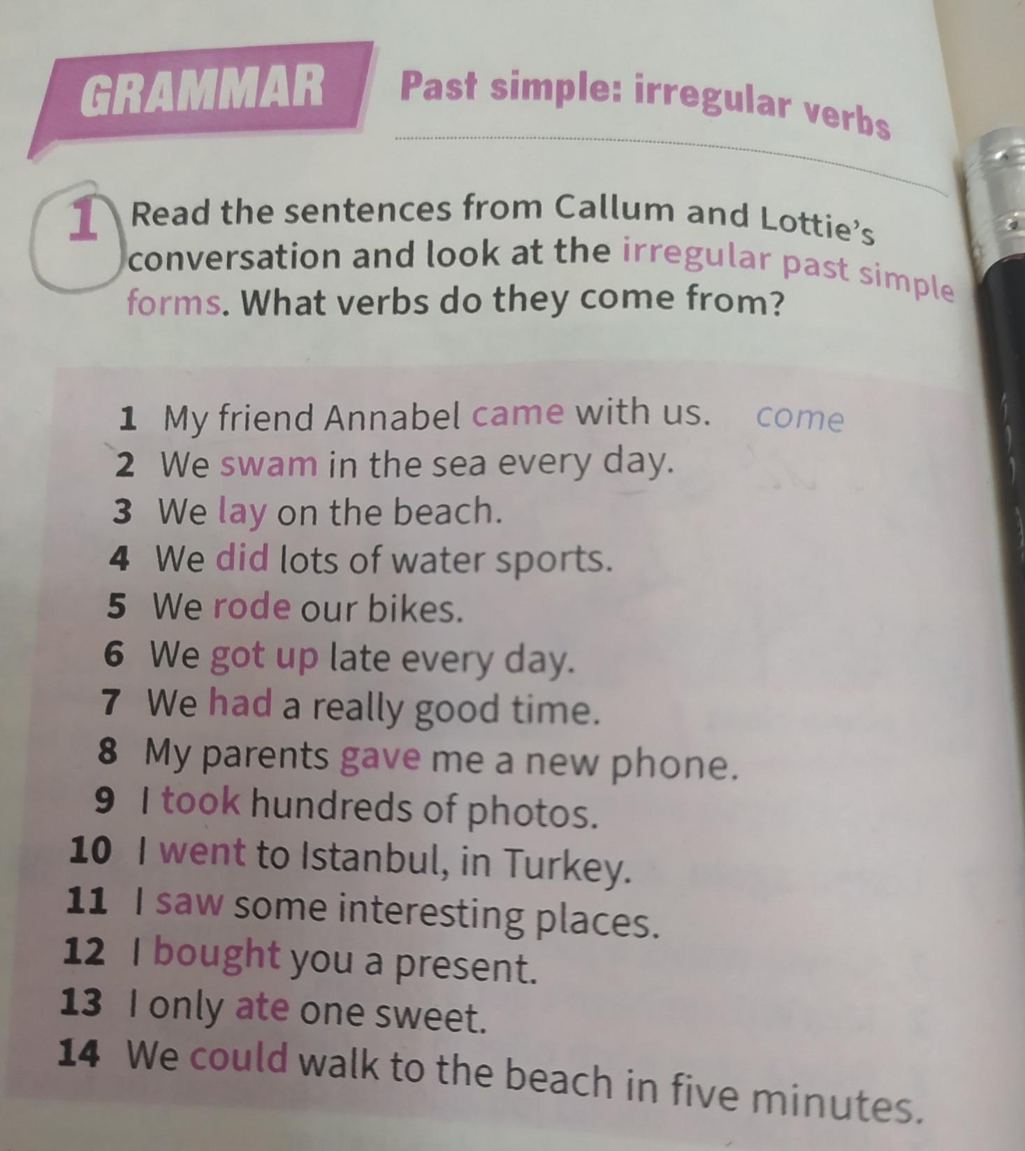 1 Read the sentences from Callum and Lottie's conversation and look at the irregular past simple forms. What verbs do they come from? 1 My friend Annabel came with us. come 2 We swam in the sea every day. 3 We lay on the beach. 4 We did lots of water sports. 5 We rode our bikes. 6 We got up late every day. 7 We had a really good time. 8 My parents gave me a new phone. 9 I took hundreds of photos. 10 I went to Istanbul, in Turkey. 11 I saw some interesting places. 12 I bought you a present. 13 I only ate one sweet. 14 We could walk to the beach in five minuter