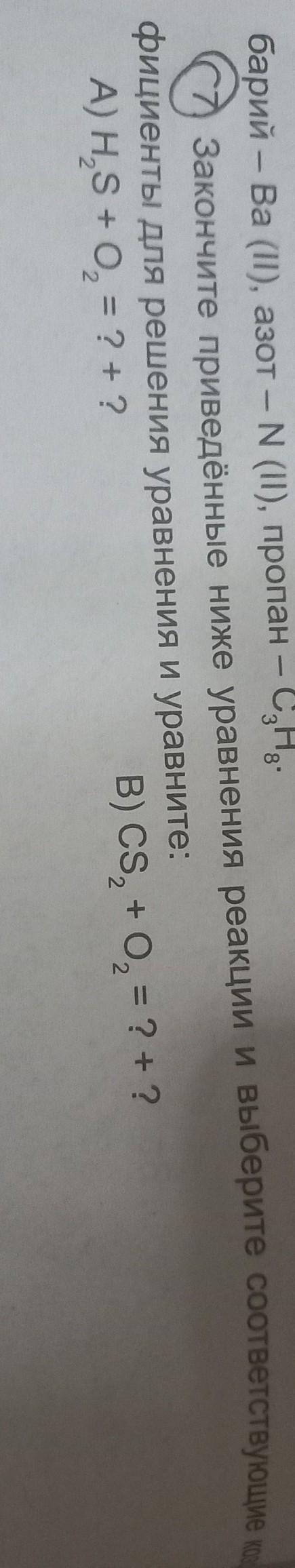 Закончите приведённые ниже уравнения реакции и выберите соответствующие коэф- для решения уравнения и уравните: фициенты A) H2S + O2 = ? + ? B) CS2 + O, = ? + ?