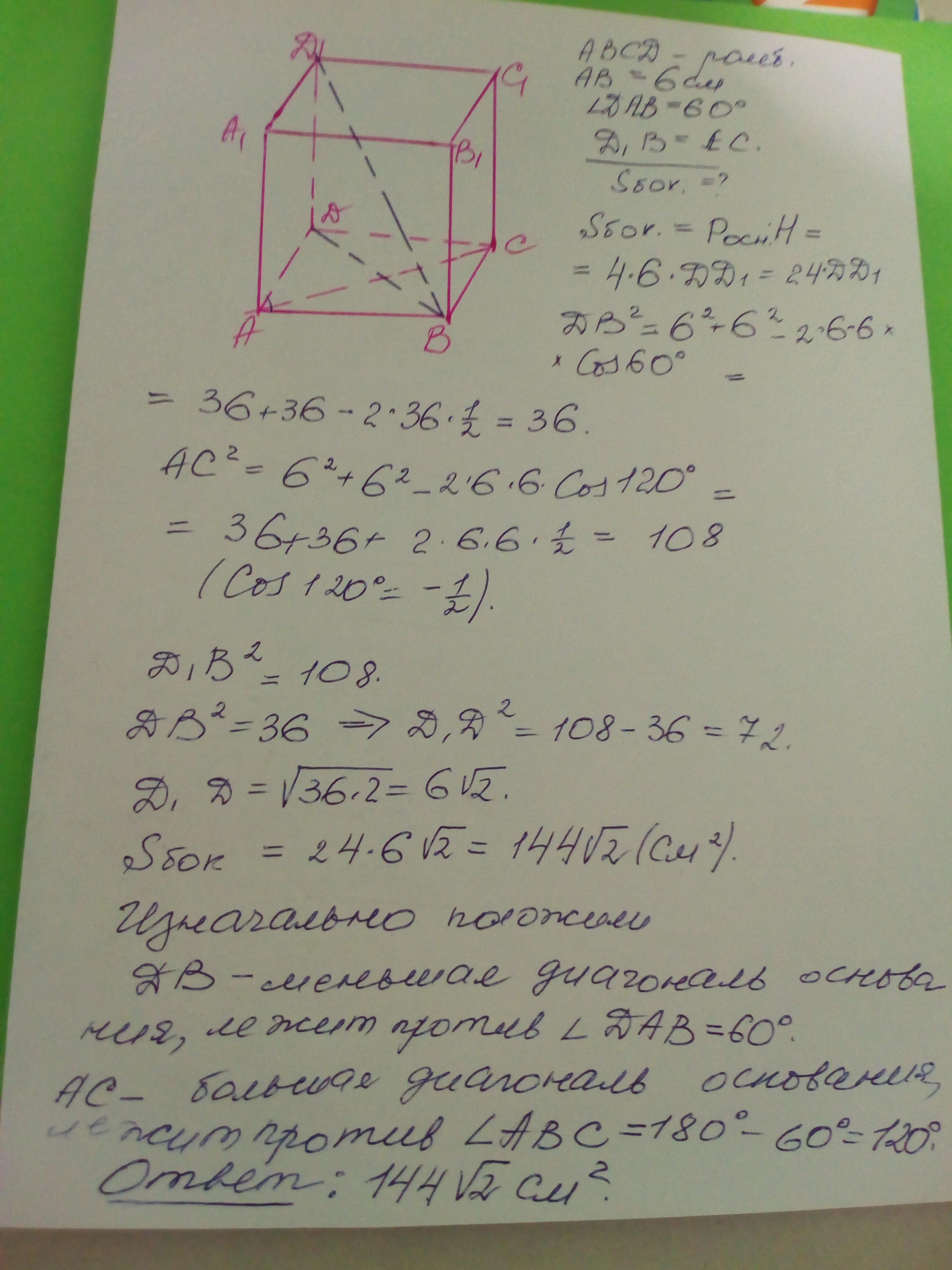 Основа прямої призми ромб зі стороною 6 см і кутом 60°. Діагональ бічної грані утворює в площиною основи кут 45°. Знайдіть об'ем призми.