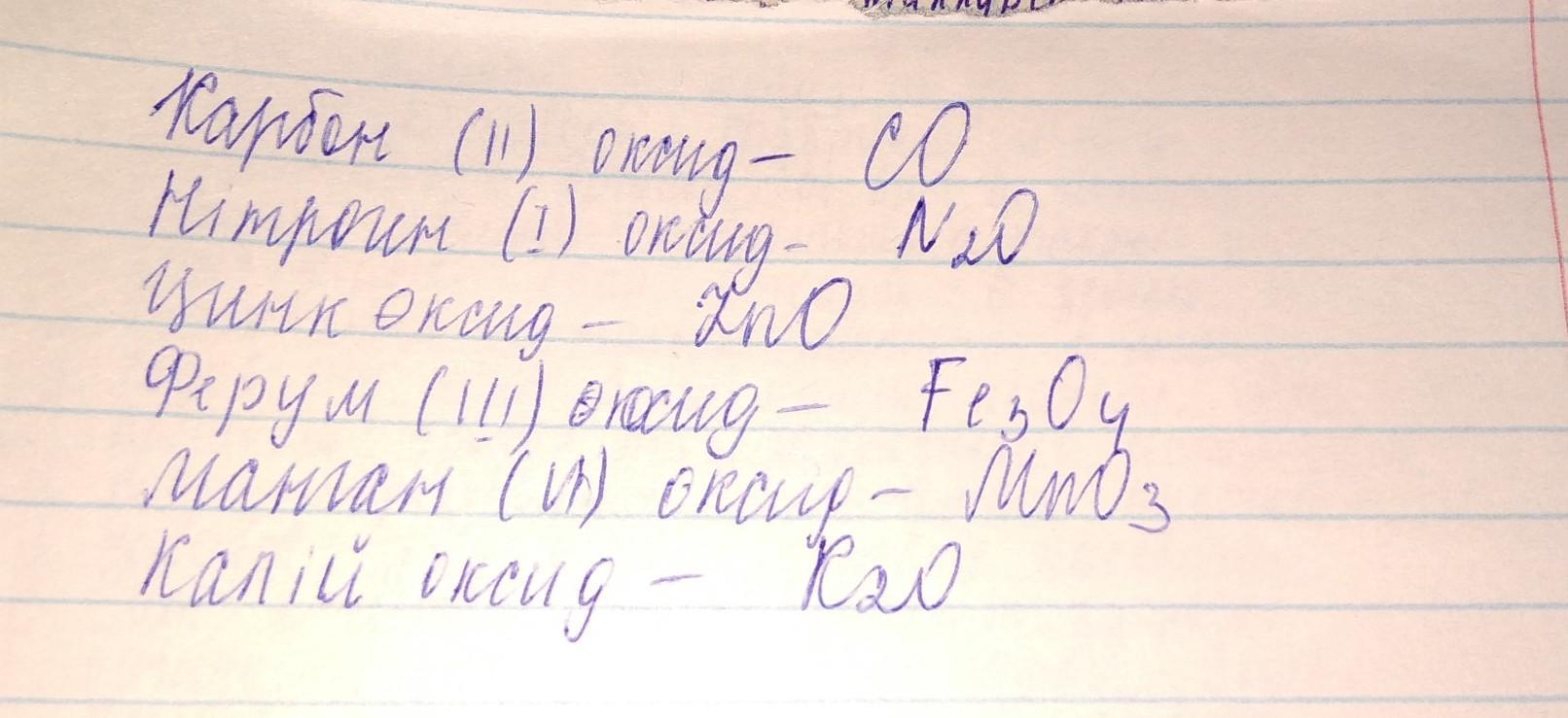 Скласти формули оксидів : карбон(ІІ) оксид, нітроген(І) оксид, цинк оксид,