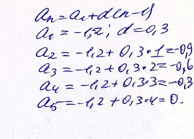 Знайдіть чотири перших члени арифметичної прогресії (an), перший член якої a1=-1,2, а різниця d=0,3.