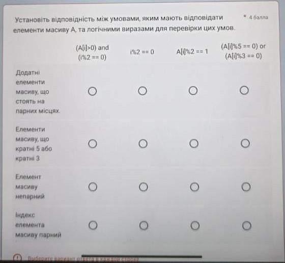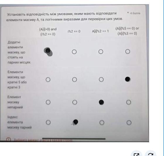 Установіть вiдповiднiсть мiж умовами, яким мають відповідати елементи масиву А, та логічними виразами для перевірки цих умов.