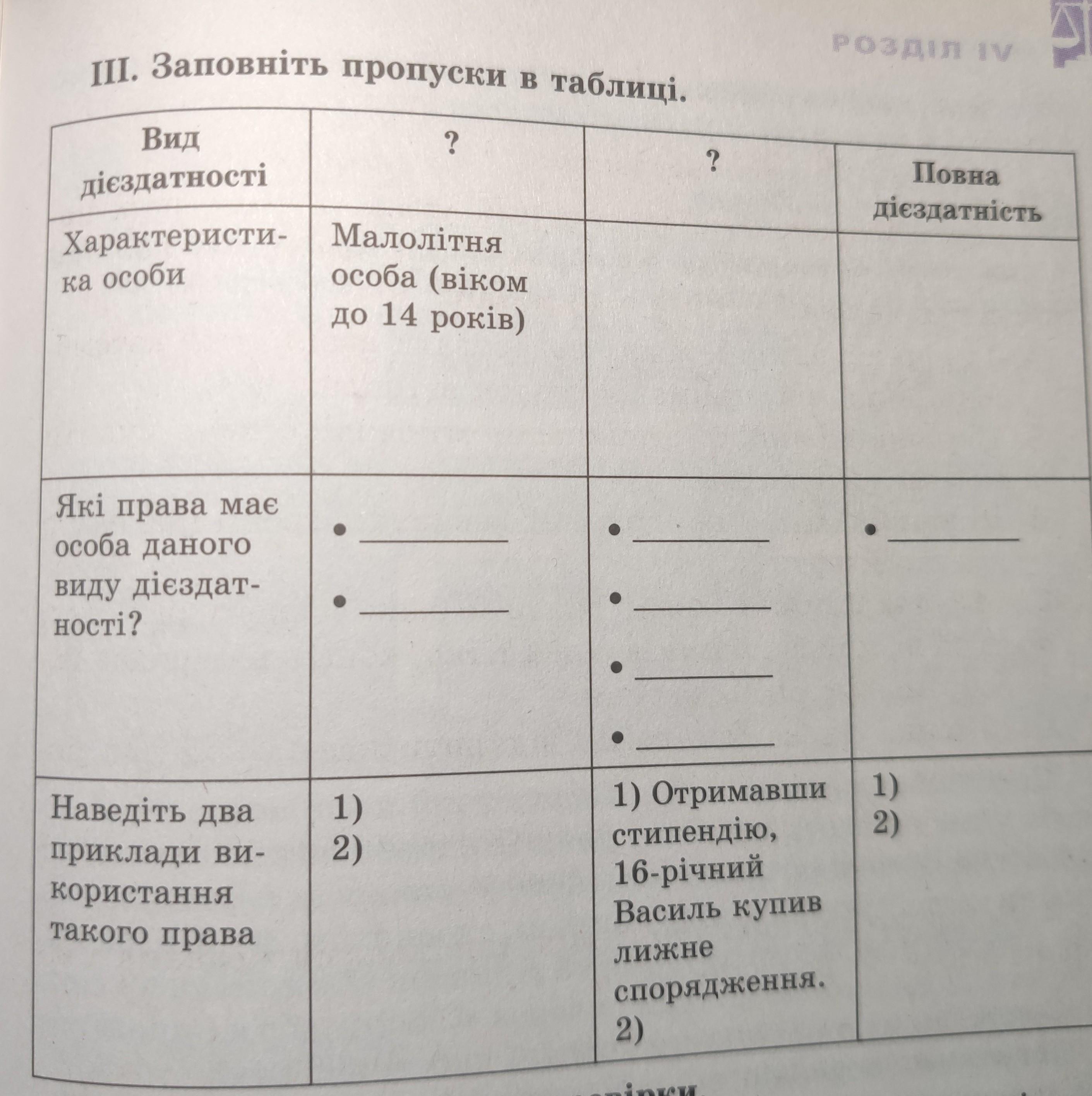 1. часткова - самостійно вчиняти дрібні побутові правочини; здійснювати особисті немайнові права на результати творчої та інтелектуальної діяльності що охороняються законом