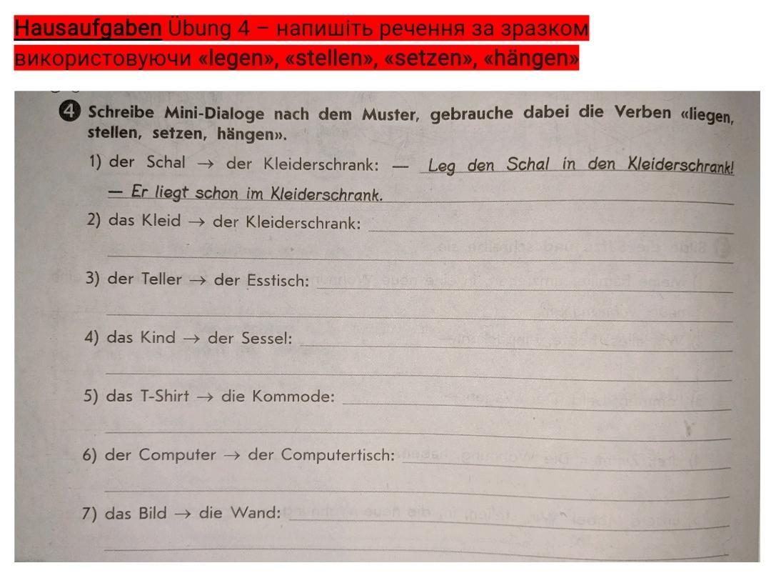Hausaufgaben Übung 4 – напишіть речення за зразком використовуючи «legen», «stellen», «setzen», «hängen»