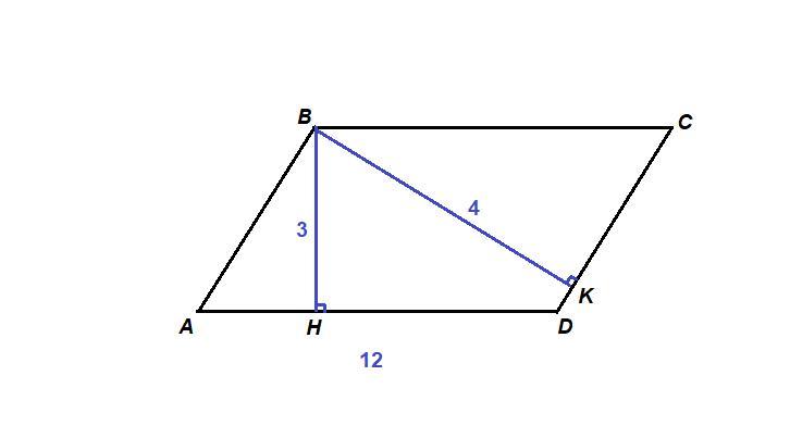 Висоти паралелограма дорівнюють 3 см і 4 см, а більша сторона паралелограма дорівнює 12 см. 1) Знайдіть меншу сторону паралелограма. 2) Знайдіть периметр паралелограма.