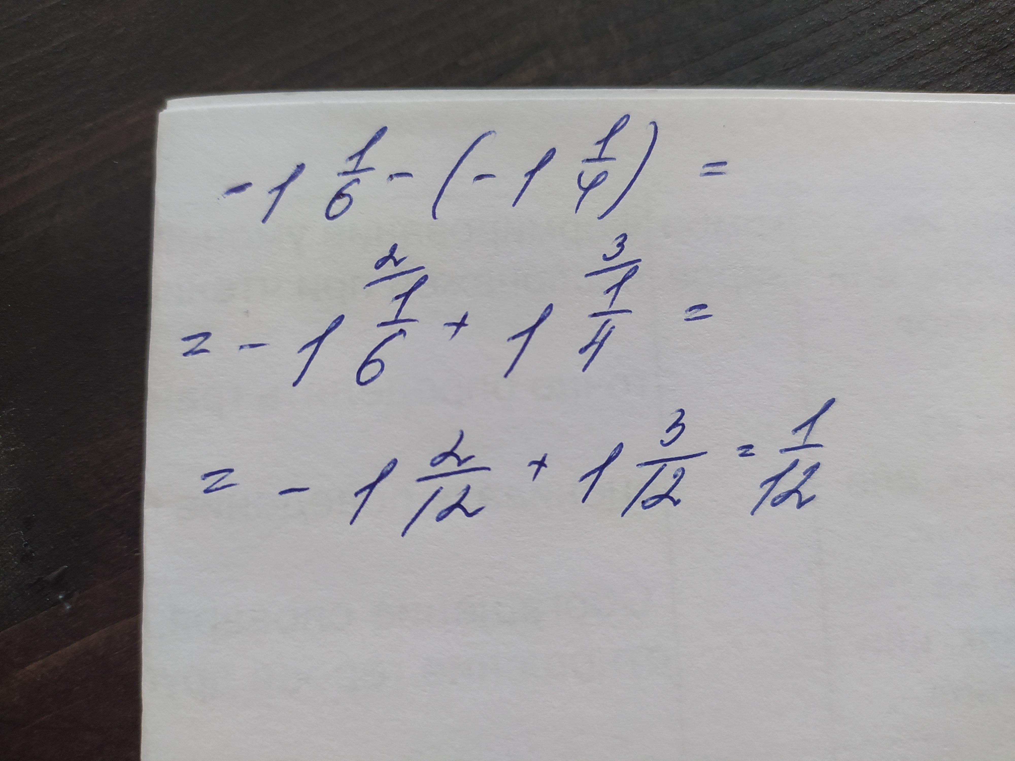 -1 1/6 + 1 1/4=1/4 - 1/6=(3-2)/12=1/12.