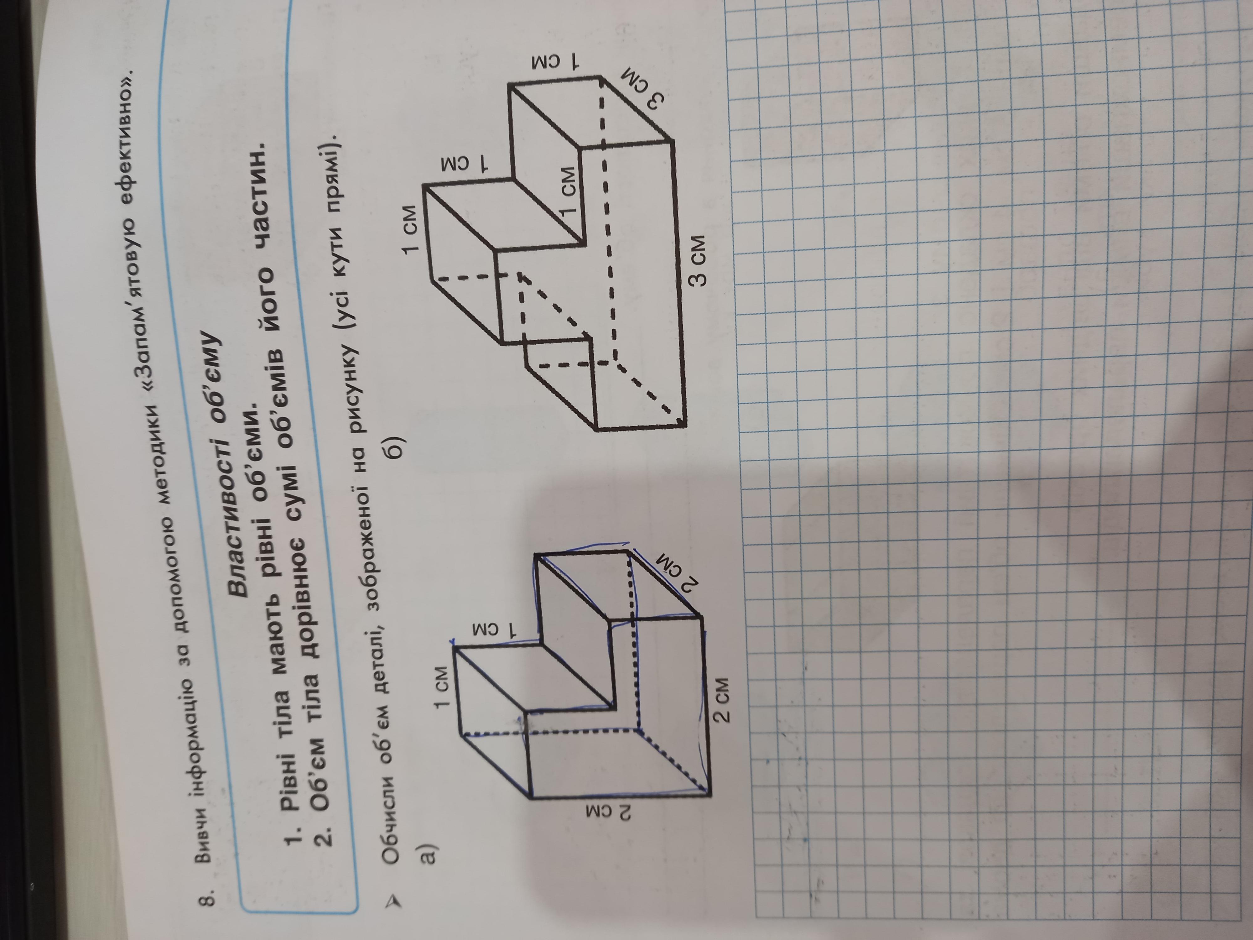 Обчисли об'єм деталі, зображеної на рисунку (усі кути прямі).