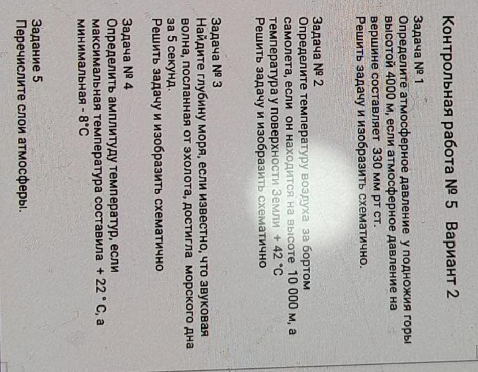 Контрольная работа № 5 Вариант 2 Задача № 1 Определите атмосферное давление у подножия горы высотой 4000 м, если атмосферное давление на вершине составляет 330 мм рт ст. Решить задачу и изобразить схематично. Задача № 2 Определите температуру воздуха за бортом самолета, если он находится на высоте 10 000 м, а температура у поверхности Земли + 42 °C Решить задачу и изобразить схематично Задача № 3 Найдите глубину моря, если известно, что звуковая волна, посланная от эхолота, достигла морского дна за 5 секунд. Решить задачу и изобразить схематично Задача № 4 Определить амплитуду температур, если максимальная температура составила + 22 °C, a минимальная - 8°С Задание 5 Перечислите слои атмосферы. помогите пожалуйста жам 33 балла