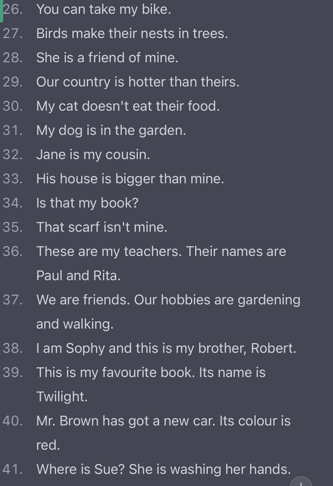26. You can take... bike. A) mine B) I C) me 27. Birds make... nests in trees. A) them B) theirs C) their D) they 28. She is a friend of .... A) mine B) I C) me 29. Our country is hotter than .... A) them B) theirs 30. My cat doesn't eat ... food. A) it B) their C) its 31. ...dog is in the garden. A) Mine B) I 32. Jane is ... cousin. A) mine B) I 34. Is that ... book? A) mine C) their D) they C) me 33. His house is bigger than .... A) mine B) I C) me C) Me 35. That scarf isn't .... A) mine B) I B) I C) me D) my D) my D) he B) my, Its D) hers, It D) My D) my D) my D) my C) me D) my 36. These are my teachers. ... names are Paul and Rita. A)They B) Them C) Their D) Theirs 37. We are friends.... hobbies are gardening and walking. A) Our B) Ours C) Theirs D) Mine 38. I am Sophy and this is ... brother, Robert. A) mine B) my C) him D) ours 39. This is ... favourite book.... name is Twilight. A) their, His C) mine, Its 40. Mr. Brown has got a new car. ... colour is red. A) His B) Her C) Its D) Their 41. Where is Sue? She is washing ... hands. A) his B) her C) hers D) its