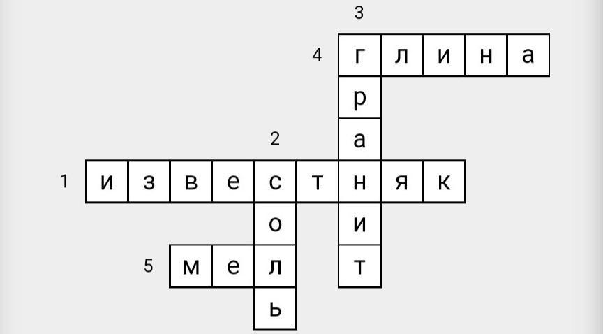Составь кроссворд к готовым ответам (гранит, соль, мел, известняк, глина)