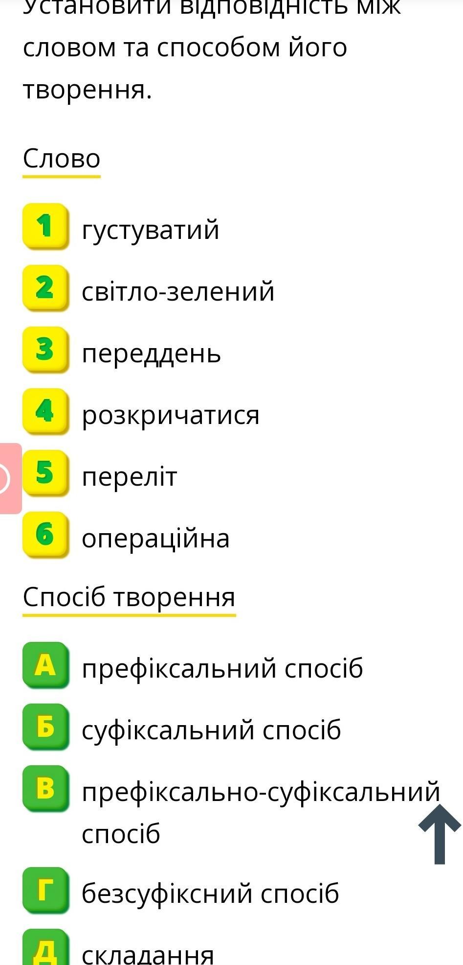 Установити відповідність між словом та способом його творення. (СЛОВО) 1 густуватий. 2 світло-зелений. 3 переддень. 4 розкричатися. 5 переліт. 6 операційна. (СПОСІБ ТВОРЕННЯ) А)префіксальний спосіб. Б)суфіксальний спосіб В)префіксально-суфіксальний спосіб. Г)безсуфіксний спосіб. Д)складання.