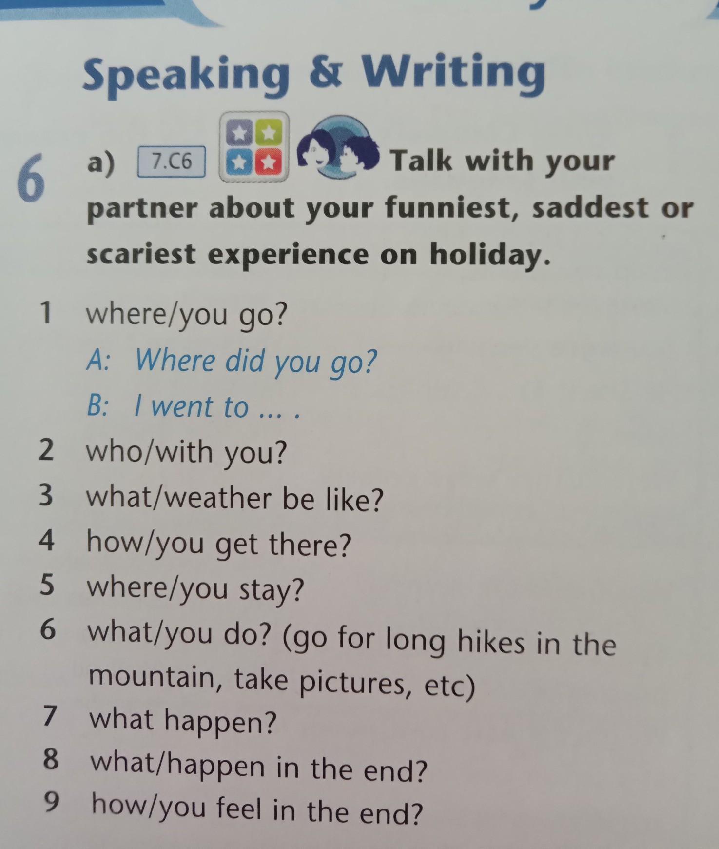 6 a) 7.C6 Talk with your partner about your funniest, saddest or scariest experience on holiday. 1 where/you go? A: Where did you go? I went to ... . 2 who/with you? 3 B: what/weather be like? how/you get there? 4 5 where/you stay? 6 what/you do? (go for long hikes in the mountain, take pictures, etc) 7 what happen? 8 what/happen in the end? 9 how/you feel in the end?
