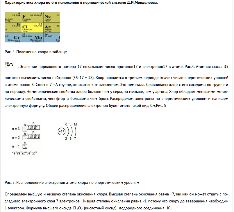 Cl-неМе,с порядковым номером 17.Это означает,что заряд ядра хлора(+17), электронов тоже 17.Т.к.относительная атомная масса хлора равна 35,5,то количество протонов(35,5-17=18,5.У хлора 3 период,значит 3 энергетических уровня.Т.к. хлор стоит в 7 группе,главной подгруппе А,то у хлора 7 электронов на 3 энергетическом уровне.Вроде,все.