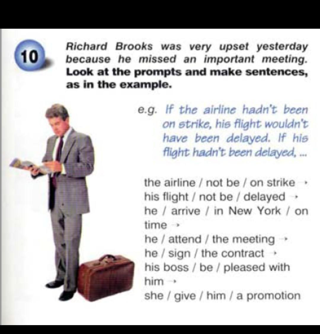 10 Richard Brooks was very upset yesterday because he missed an important meeting. Look at the prompts and make sentences, as in the example. e.g. If the airline hadn't been on strike, his flight wouldn't have been delayed. If his flight hadn't been delayed,... the airline / not be / on strike his flight / not be / delayed he arrive in New York / on time → he/ attend / the meeting he/sign / the contract his boss / be/ pleased with him she/give / him/ a promotion