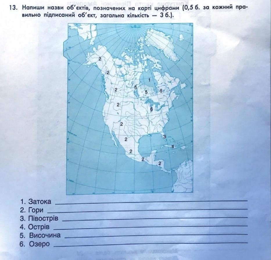 13. Напиши назви об'єктів, позначених на карті цифрами (0,5 б. за кожний пра- вильно підписаний об'єкт, загальна кількість - 3 6.). 1. Затока 2. Гори 3. Півострів 4. Острів 5. Височина 6. Озеро 2