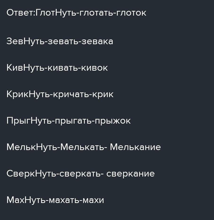 Спишите глаголы. Докажите, что они образованы суффиксальным спосо- бом. Обозначьте суффикс. Какое значение он придаёт глаголам? Подберите к ним подходящие по смыслу существительные. глотать; зевнуть, кивнуть, крикнуть, прыгнуть, Глотнуть мелькнуть, сверкнуть, махнуть.