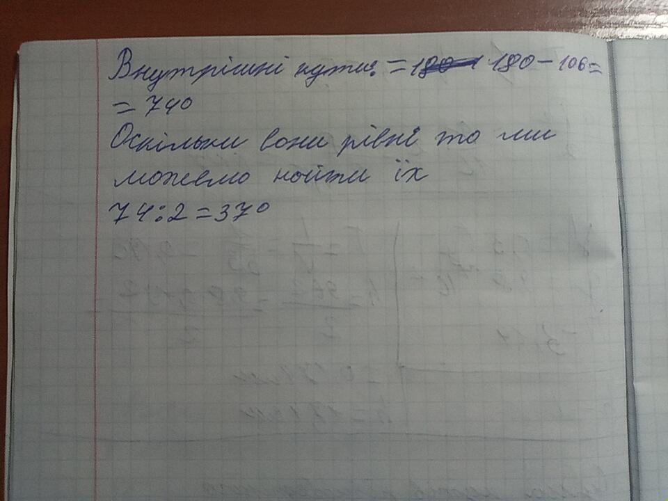 Внутрішніі кути=180-106=74°