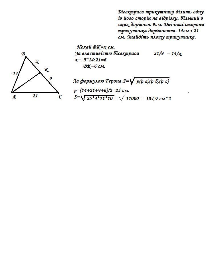 Бісектриса трикутника ділить одну із його сторін на вiдрiзки, більший з яких дорівнює 9см. Дві інші сторони трикутника дорівнюють 14см i 21 см. Знайдіть площу трикутника.