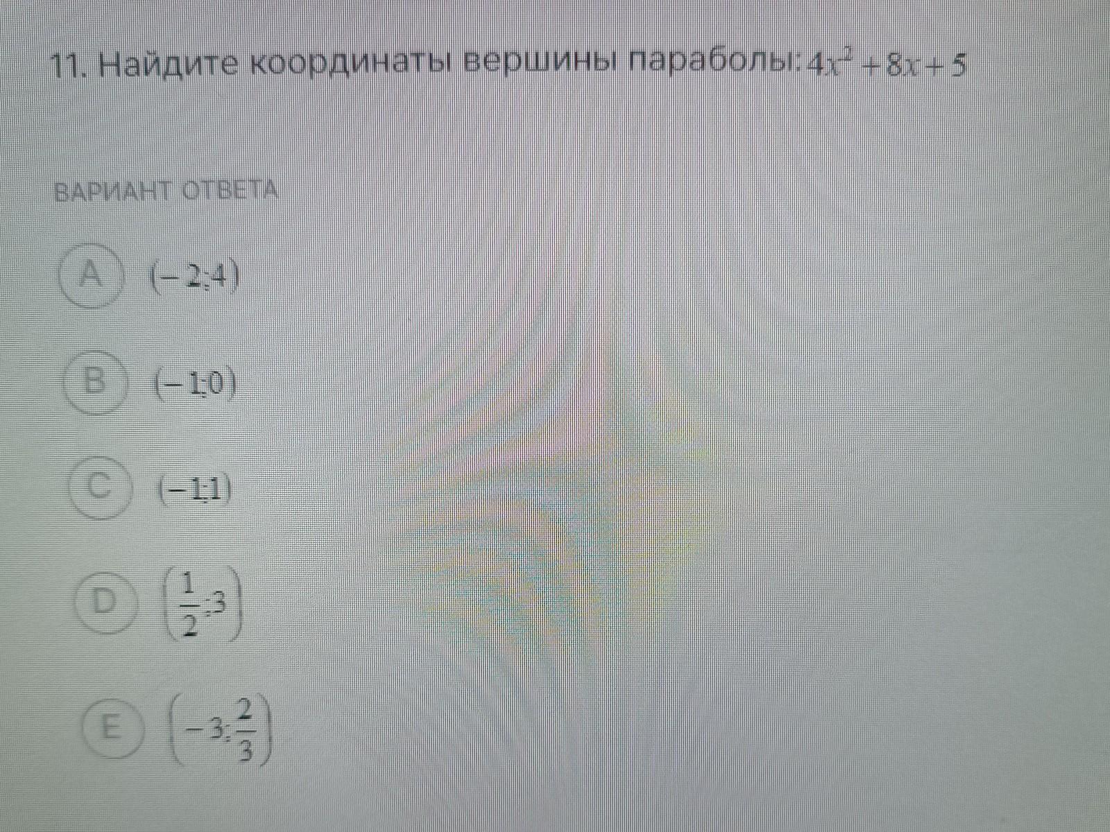 11. Найдите координаты вершины параболы:4x² +8x+5 ВАРИАНТ ОТВЕТА A (-2;4) B С D LU (-10) (-11) نيا
