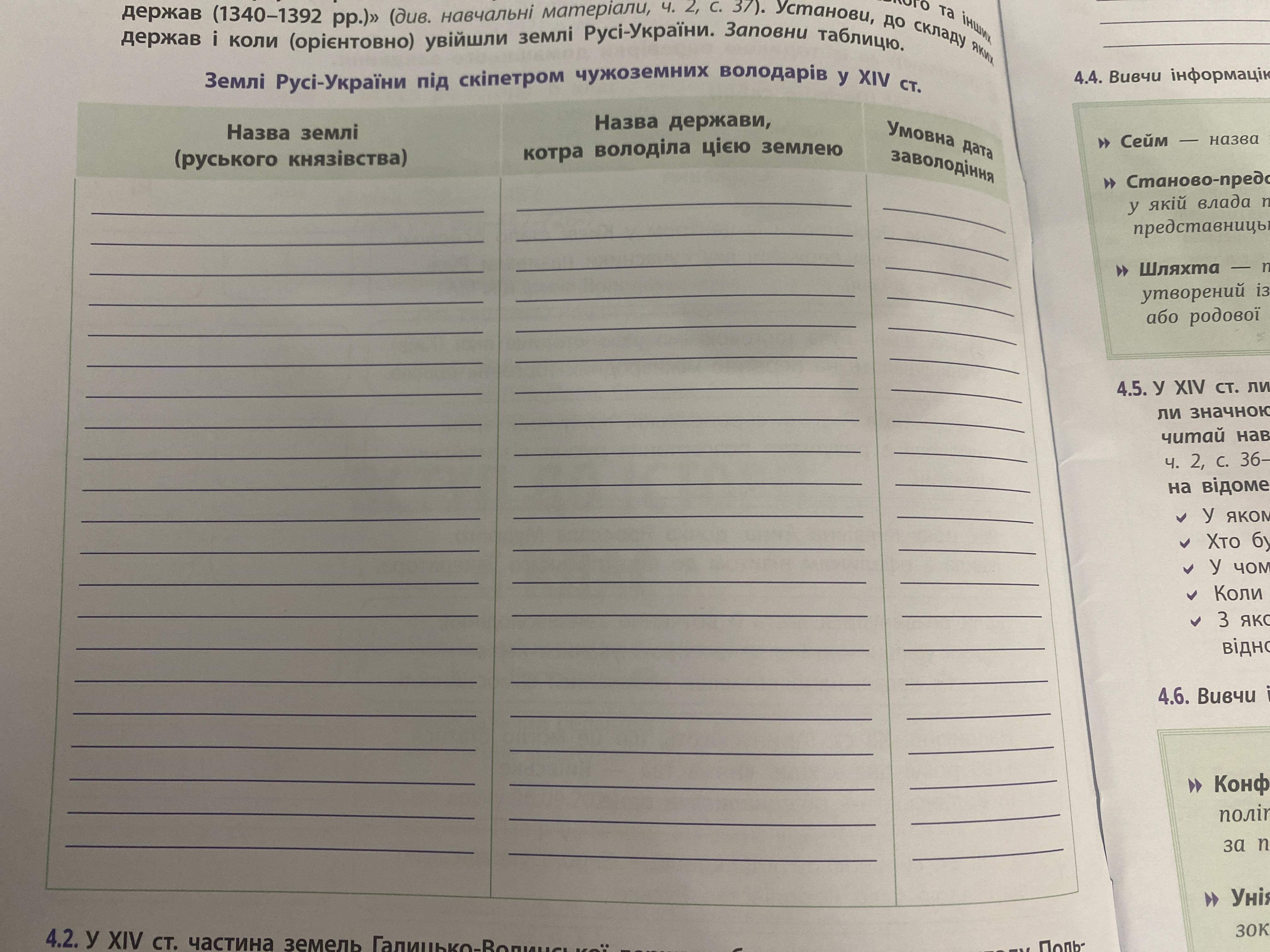 4.1. Розглянь карту «Українські землі у складі Великого князівства Литовського та інших держав (1340-1392 рр.)» (див. навчальні матеріали, ч. 2, с. 37). Установи, до складу яких держав і коли (орієнтовно) увійшли землі Русі-України. Заповни таблицю.